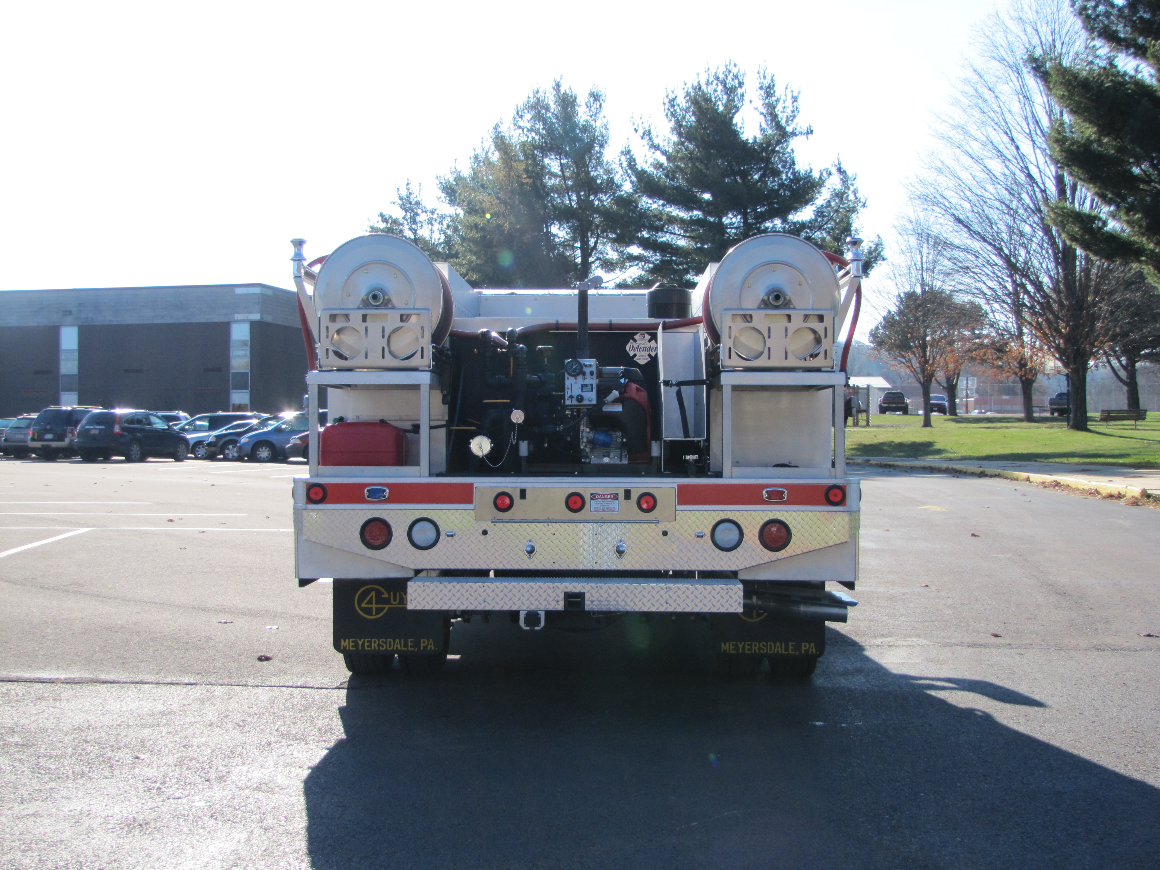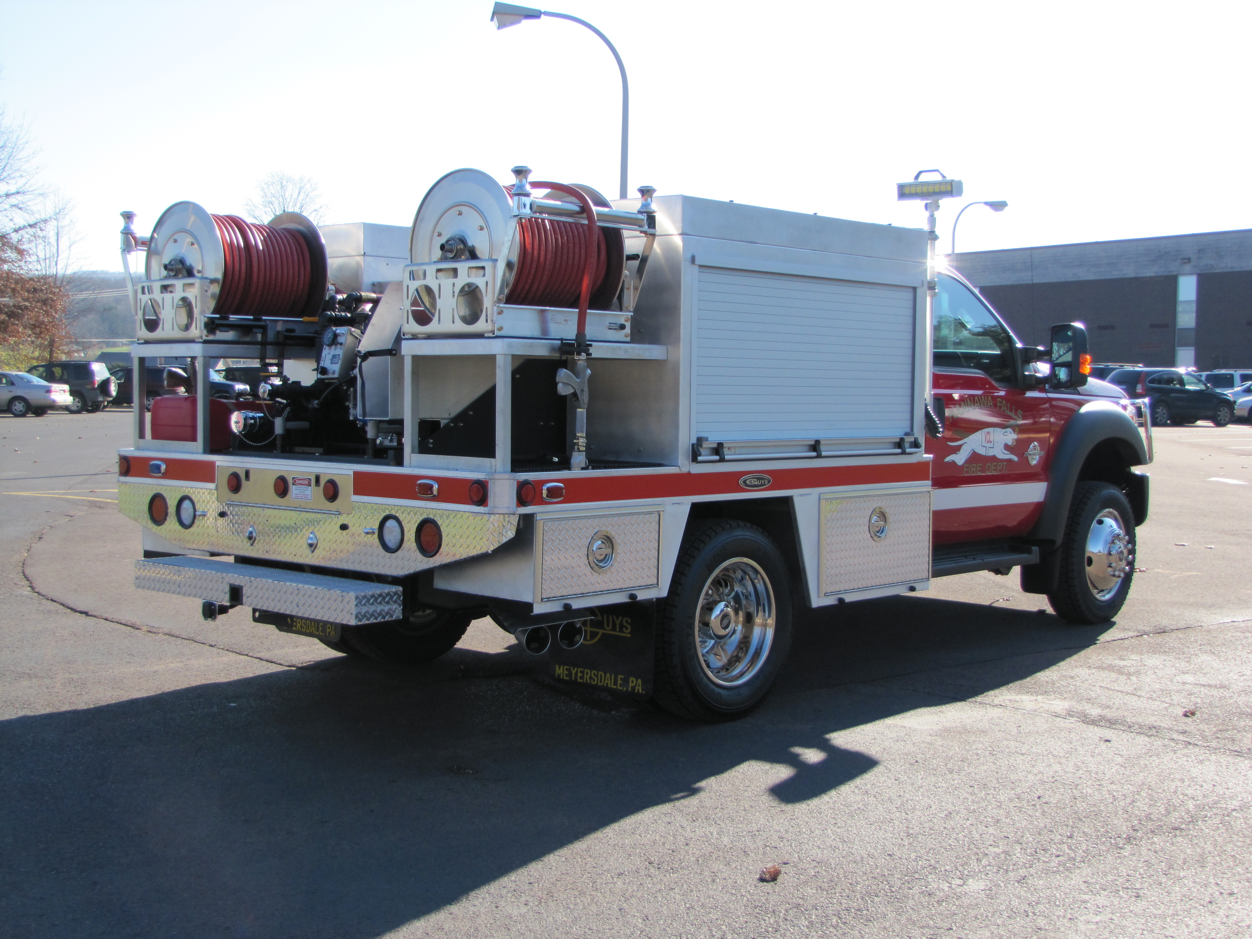 Mini Pumper with a 6.7L Power Stroke Diesel engine on a Ford F550 chassis. The pump is a Darley 1.5 AGE skid unit with an 18HP Honda engine and a 250 gal. poly tank. Features include Whelen NFPA lighting, aluminum flat bed, aluminum compartments with roll-up doors, two electric rewind reels for 200 ft. of 3/4 in. hose, and a 12,000 lb. front-mount winch.